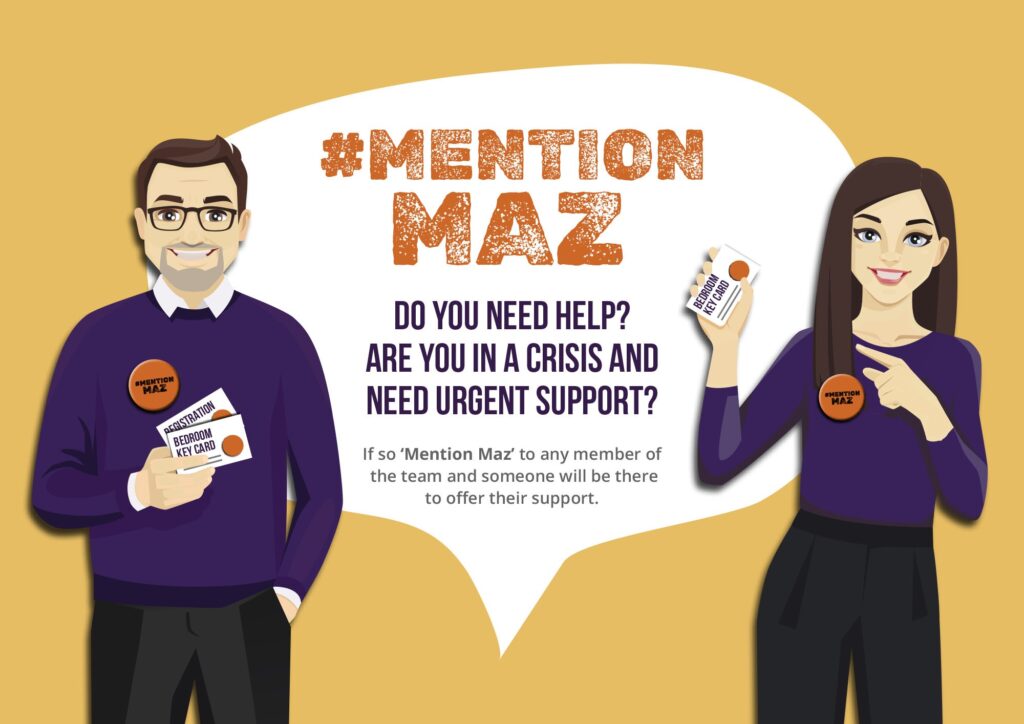 If you need any support, feel unsafe or just want to talk to someone – ‘Mention Maz’ to any of our team or look out for our team members wearing our ‘Mention Maz’ orange pin badge.